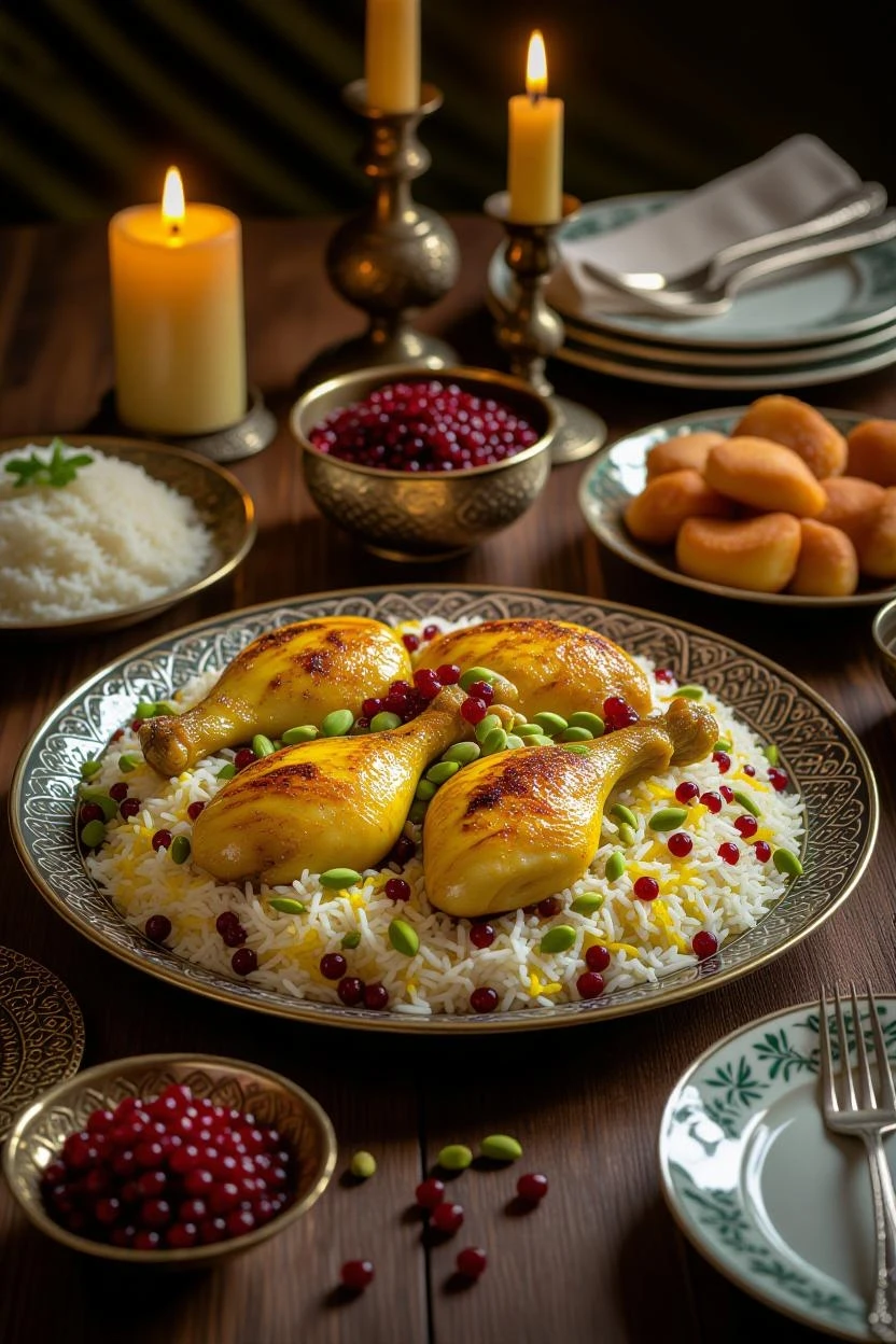 Saffron-braised chicken drumstick with pistachio saffron rice and barberries.